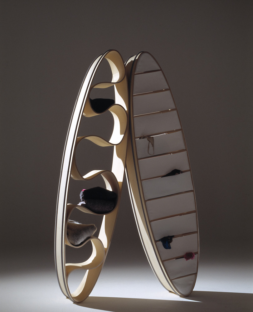 For laid back storage of clothes. An alternative to the rigidity of storage as we know it. No tissue paper, no closed doors, no starch. Clothes are generally chucked over beds, chairs or directly on to the floor, somehow they have felt more at home there than in solid cupboards for a long time now. These cupboards provide fair treatment to the clothes, the eyes and the surroundings. They may be leaned against the wall, tilted or slung on the floor. As casual in positioning as they are in use.