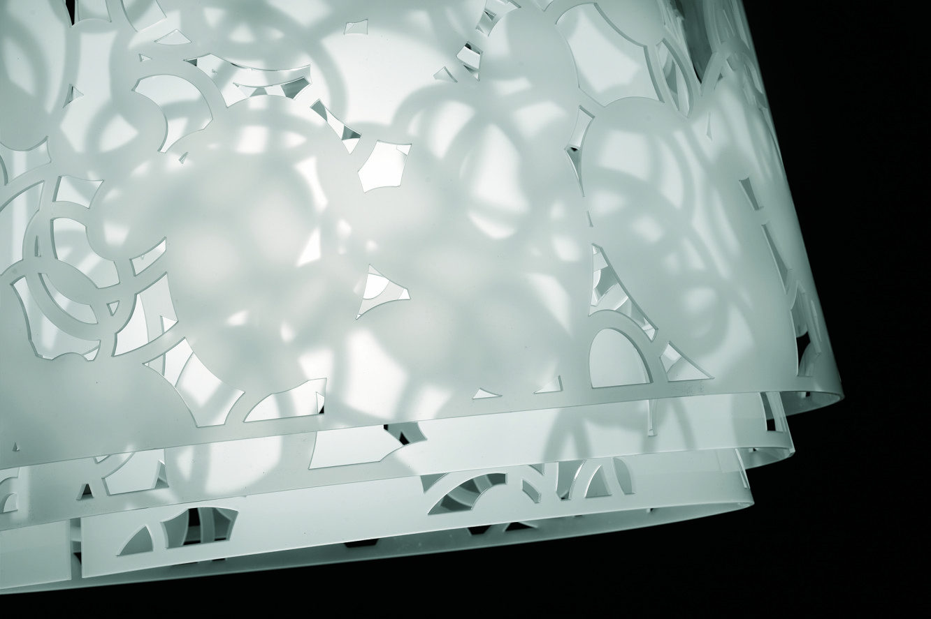 Inspired by the way light in a forest filters through thousands of layers before reaching the ground. The pattern is based on a simple abstraction of the ellipse, which is positioned seemingly freely on all three layers. This creates depth of field and shadowplay on the pendant itself — an unusual and calming feature for a lamp. From nowhere does the light source blind the eye in spite of the hundreds of holes in the pendant.
