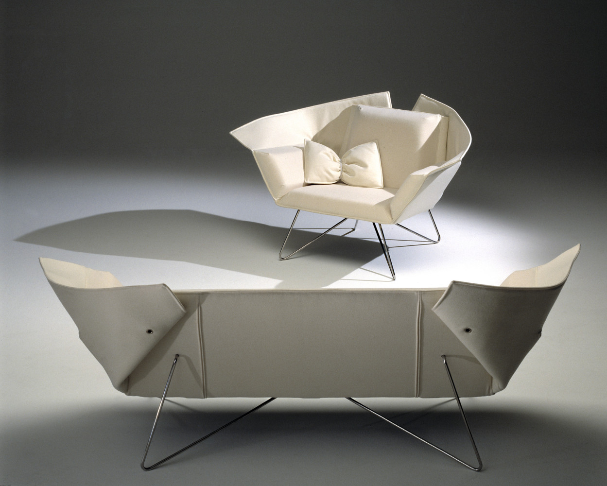 The upholstery is, in contrast to the norm, sewn first. The core – plywood and foam – is then positioned in pockets in the upholstery, which zips together, and is then mounted on the steel frame. This enables manufacturing to be conducted on a flat level until the very last stage, which eases access to detailing and speeds up the process.