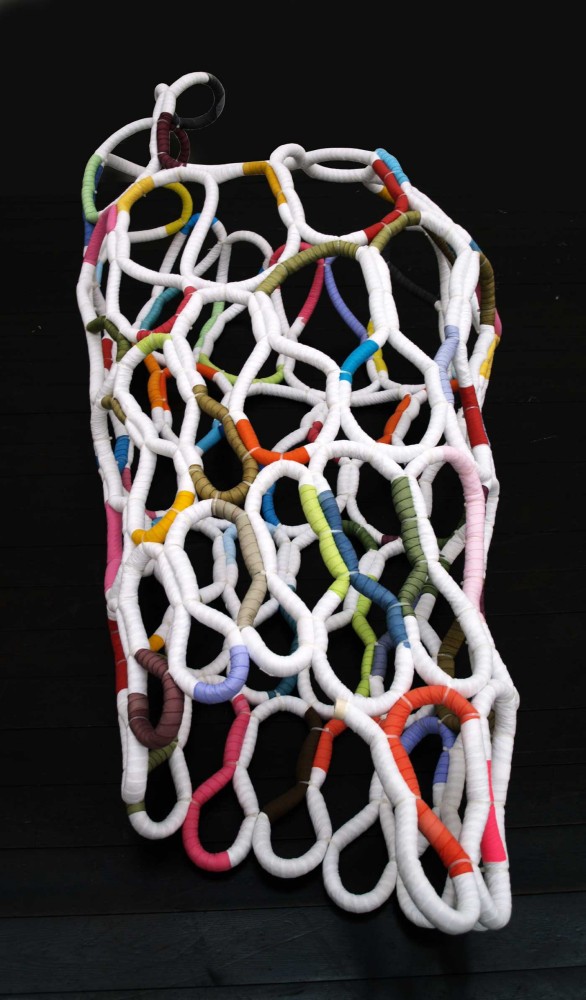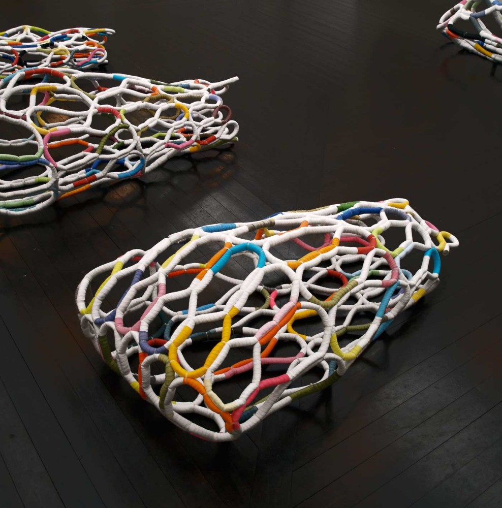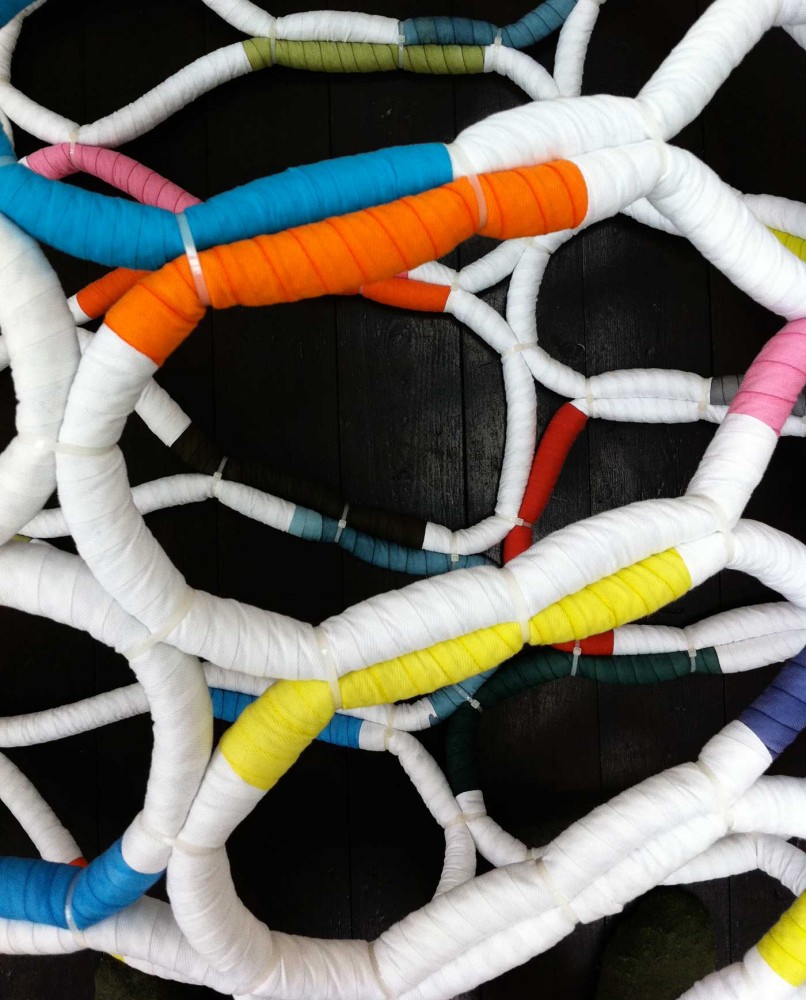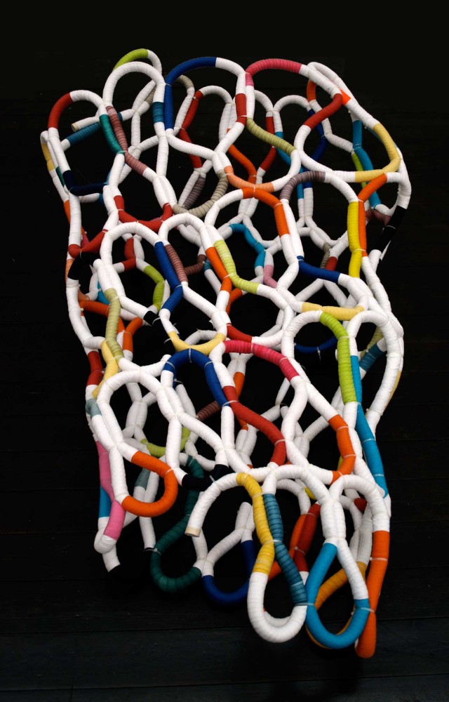 It's Complicated Five hand made, time consuming, useless one-offs. Materials: Paper cord and dyed cottonYear: 2011