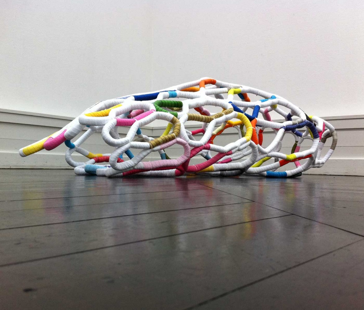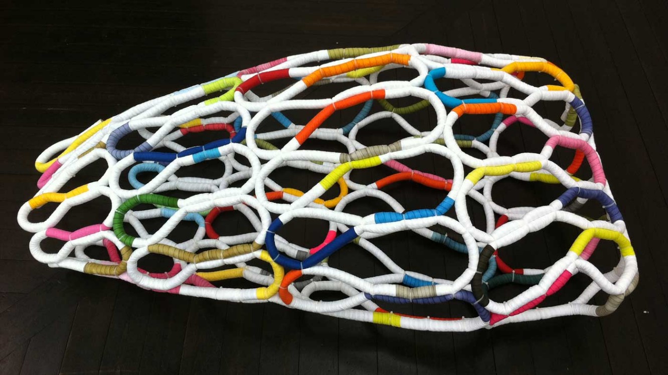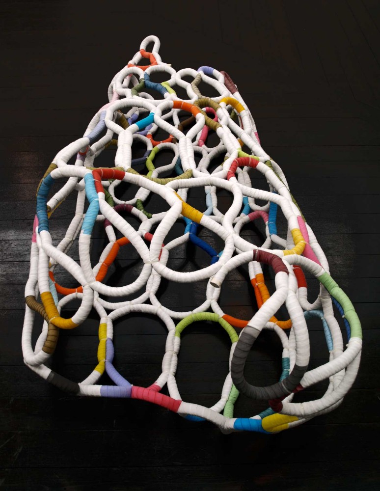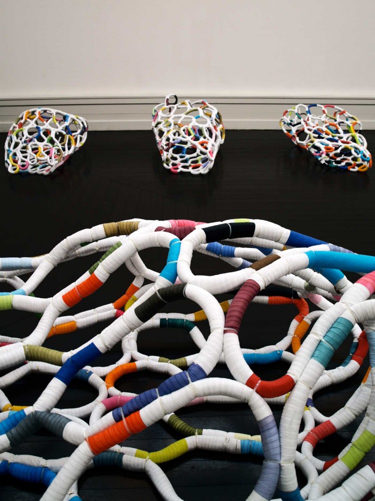 It's Complicated Five hand made, time consuming, useless one-offs. Materials: Paper cord and dyed cottonYear: 2011