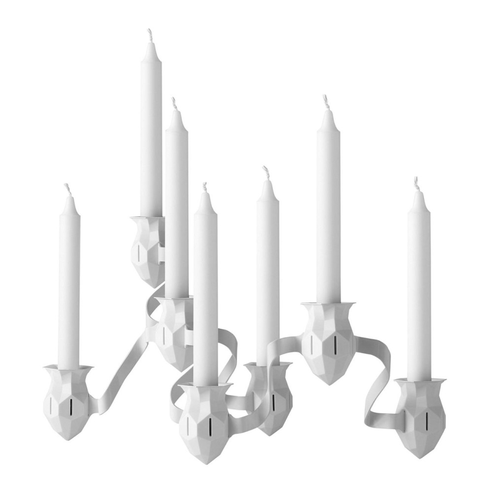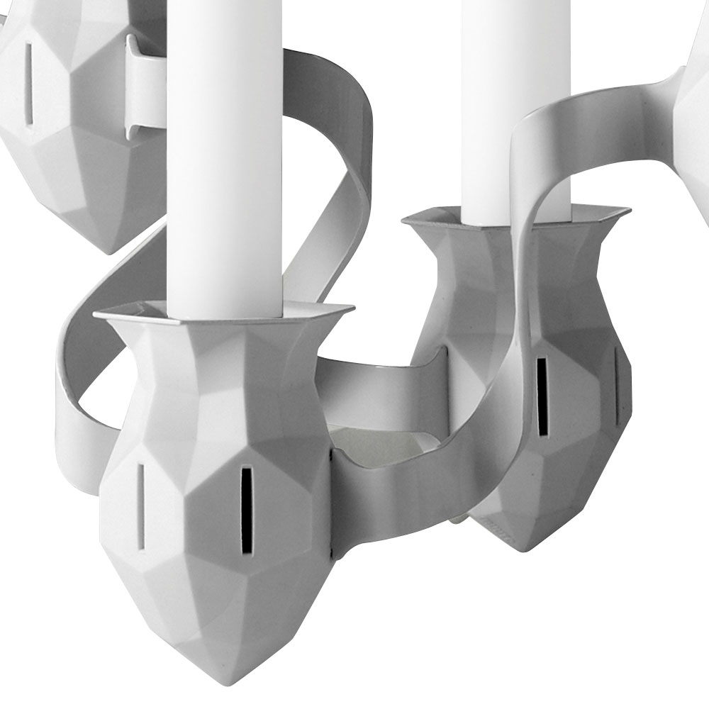 A candelabra that is everything but streamlined. As the saying goes: the more elements you join together, the merrier the result. Can be constructed in infinite ways, as the beholder pleases. The design is a blend of the formal and the informal. Crystal like candle holders are made of the softest matt rubber, the garland like arms are pressed in hard-wearing steel and coated. Assembly can be conducted with a sense of meticulous symmetry, or with complete chaos, as you wish. Using 7, 14, 21, 42, 84, 168, 332, 664 elements, according to desire.
